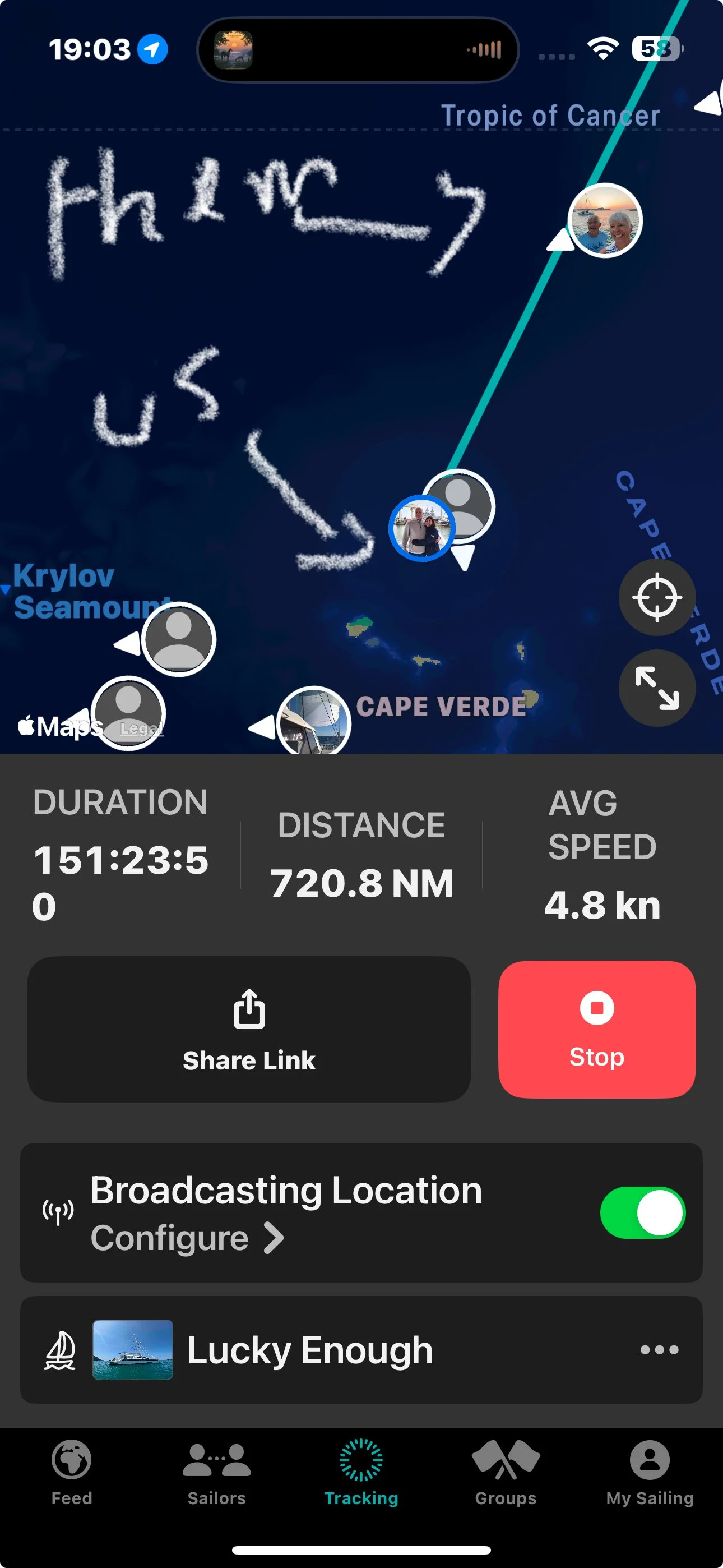 We’ve travelled 720 nm (152 hrs) and are still showing 181 nm from the Verdes, while Full Circle III is behind us taking a different angle.