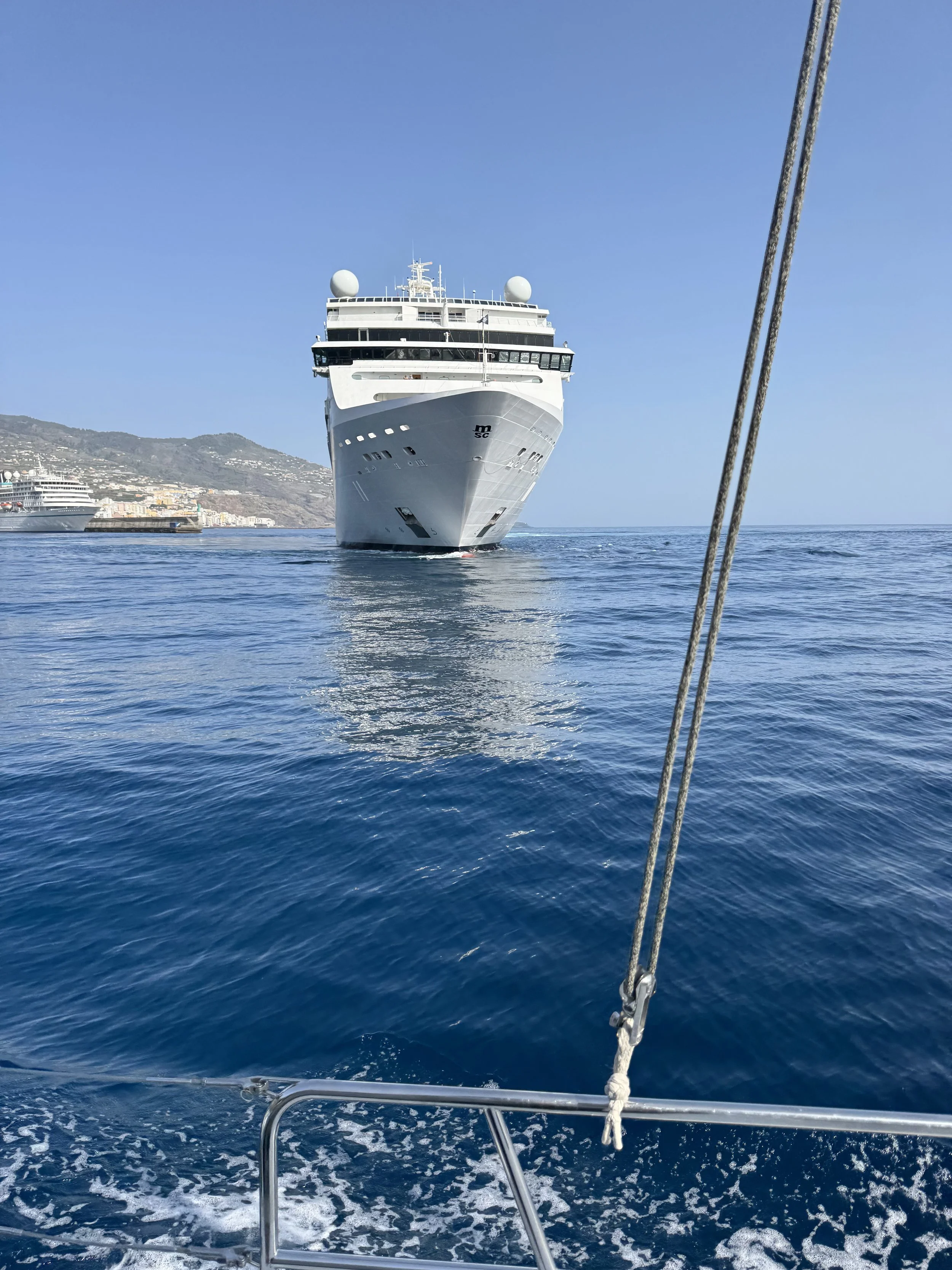 We had barely cleared the massive steel gate of Santa Cruz de La Palma when a cruise ship loomed much closer than we liked—and at the exact same moment, Ryan stepped on a shard of glass that had to be dug out of his toe. Not exactly the send-off we envisioned.