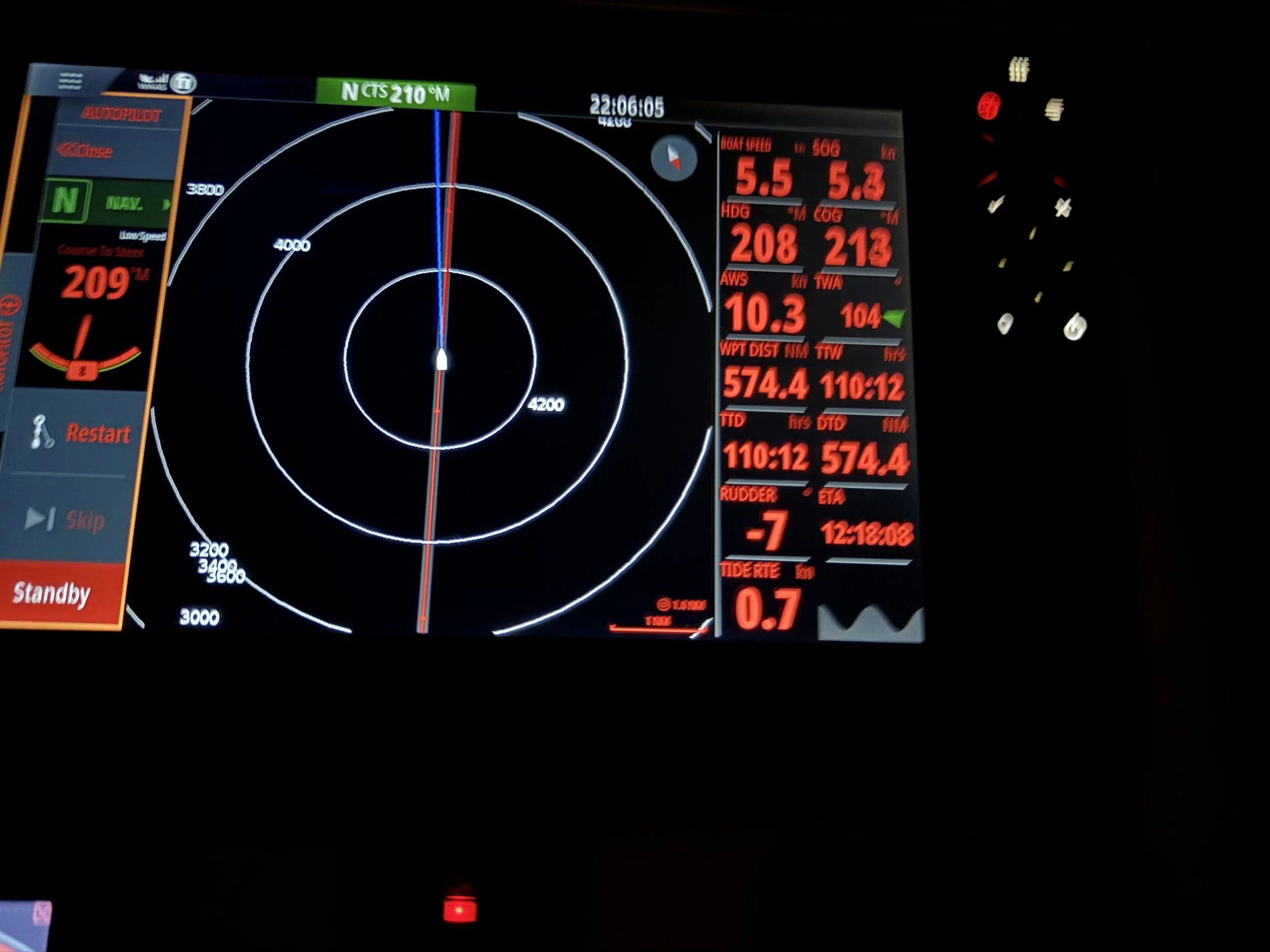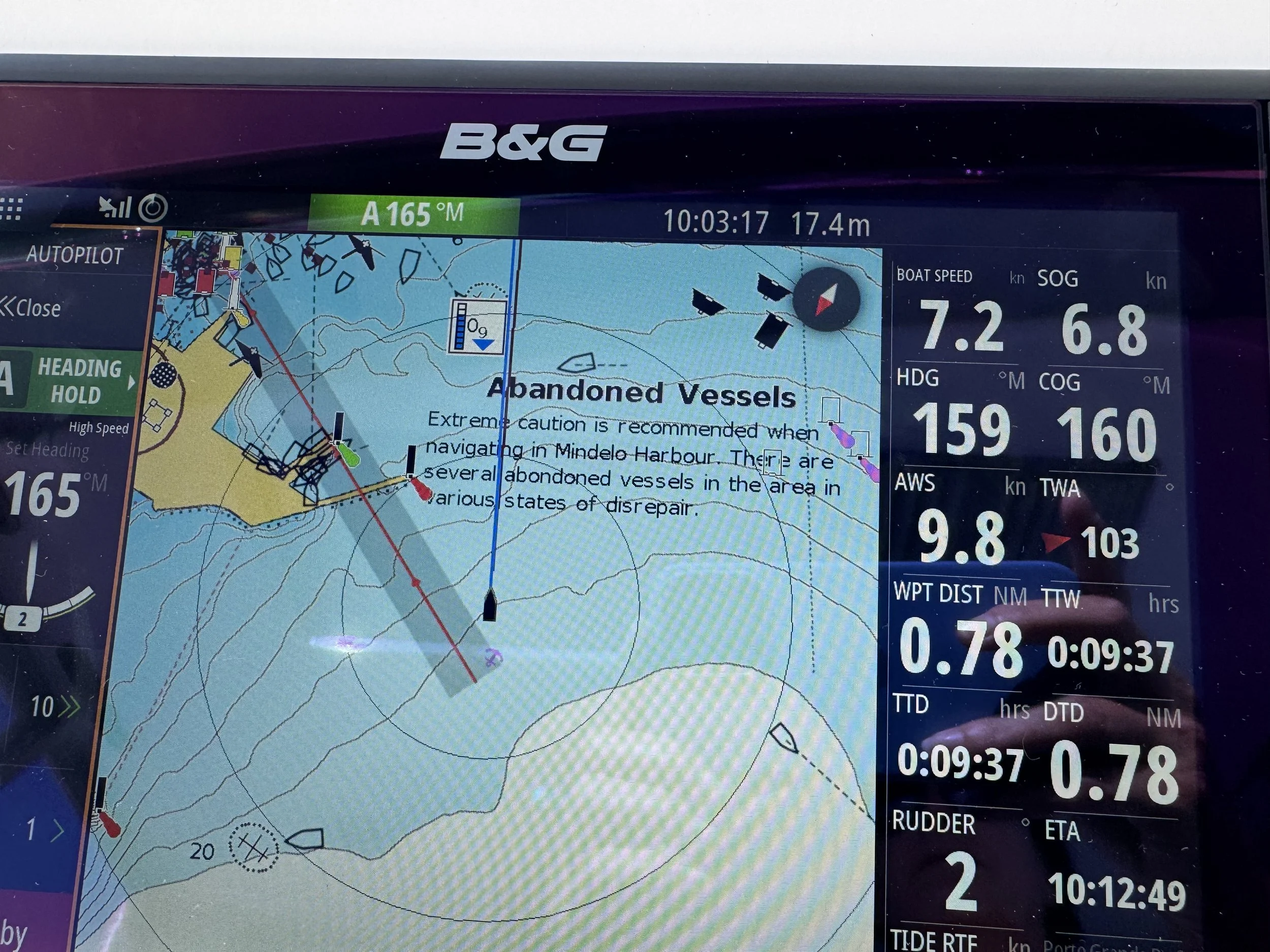 As you can see, however, the screen also showed our Speed Over Ground (SOG) at 5.0kn… while our boat speed read 0.0kn.