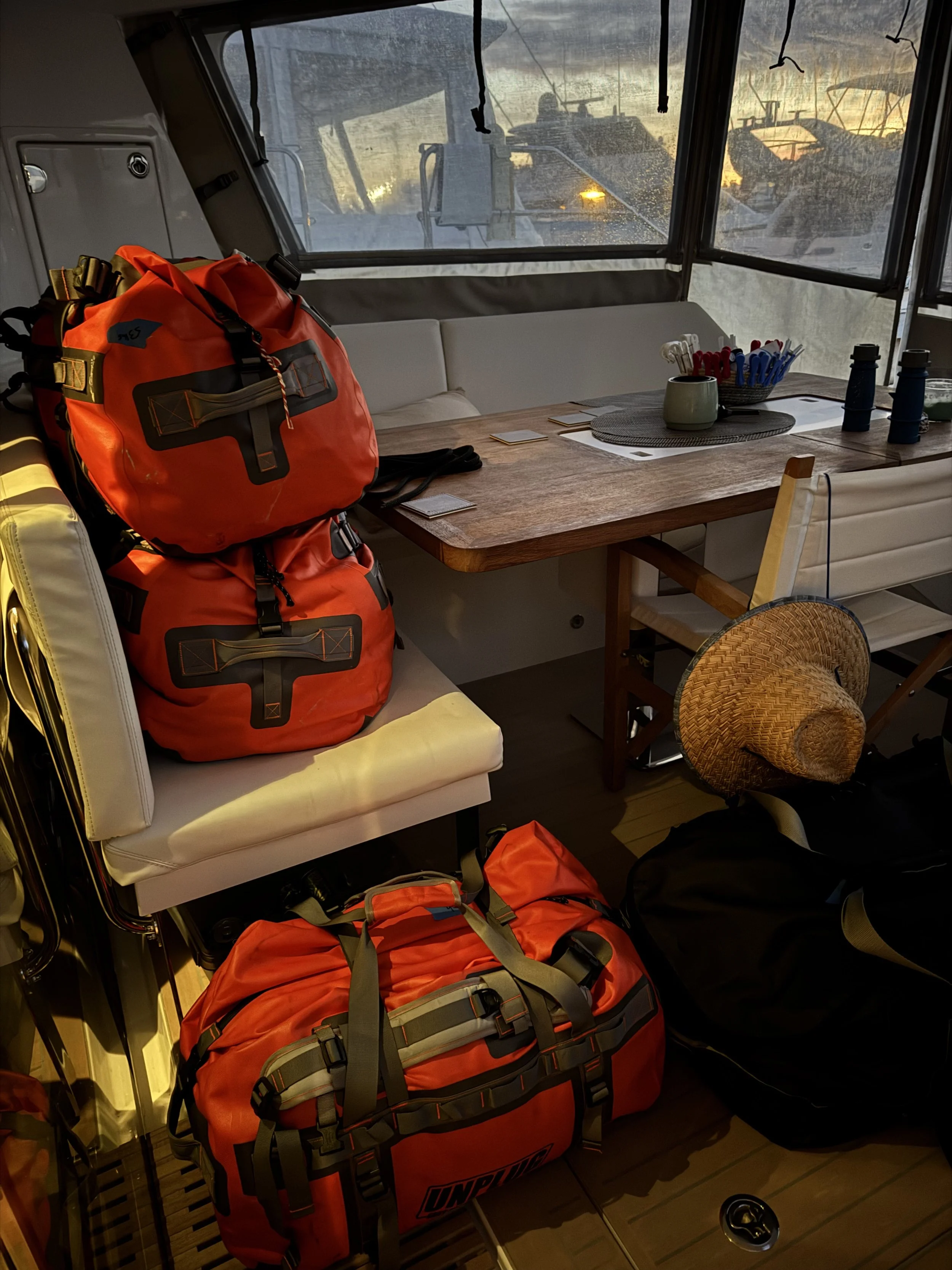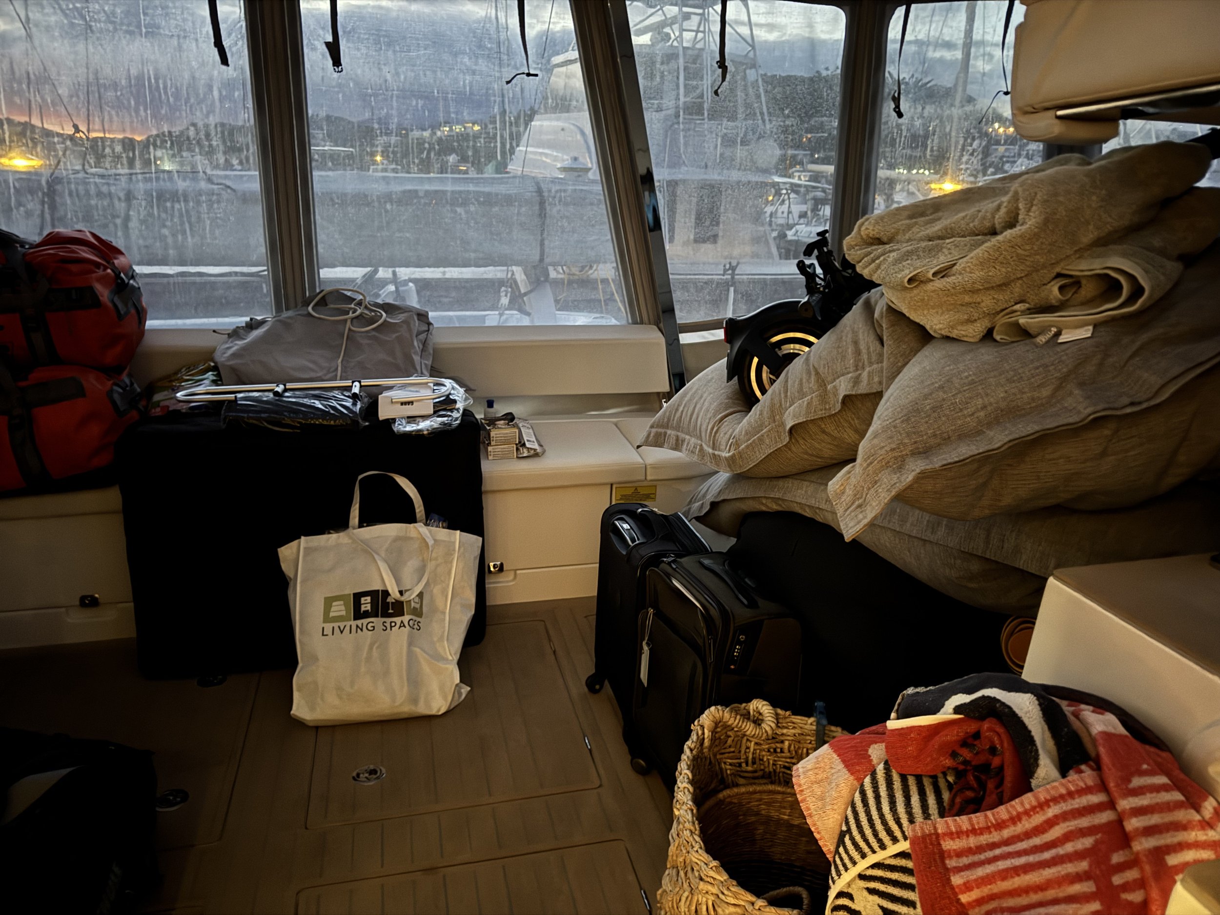 …though ours began in a whirlwind of boxes, bins, and sticky notes. For seven mind-boggling days, we lived in a cycle of decisions: keep, give away, or leave on board. Every single item on Lucky Enough had to be touched, evaluated, and either packed into luggage, gifted to new hands, or inventoried and stored neatly for the buyers, or for our return assuming the boat did not sell.